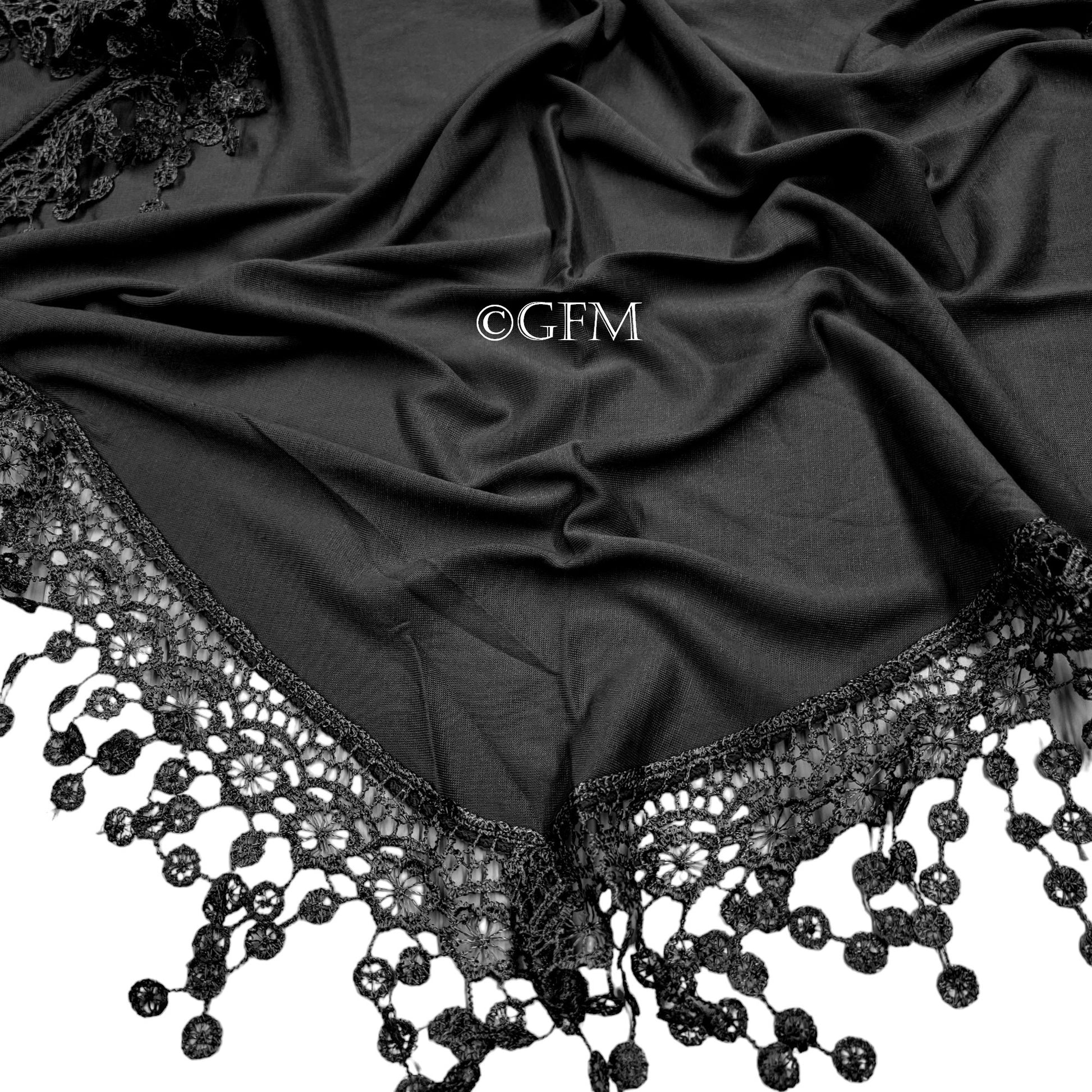 Triangle Scarf with Lace and Tassels - Black (TRI-PLN-KL)
